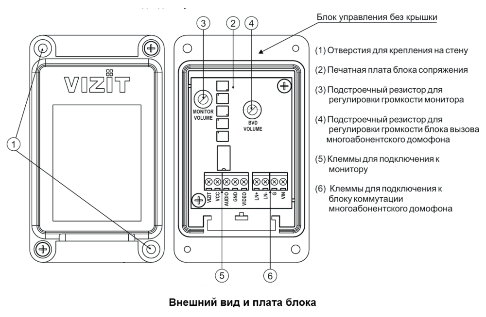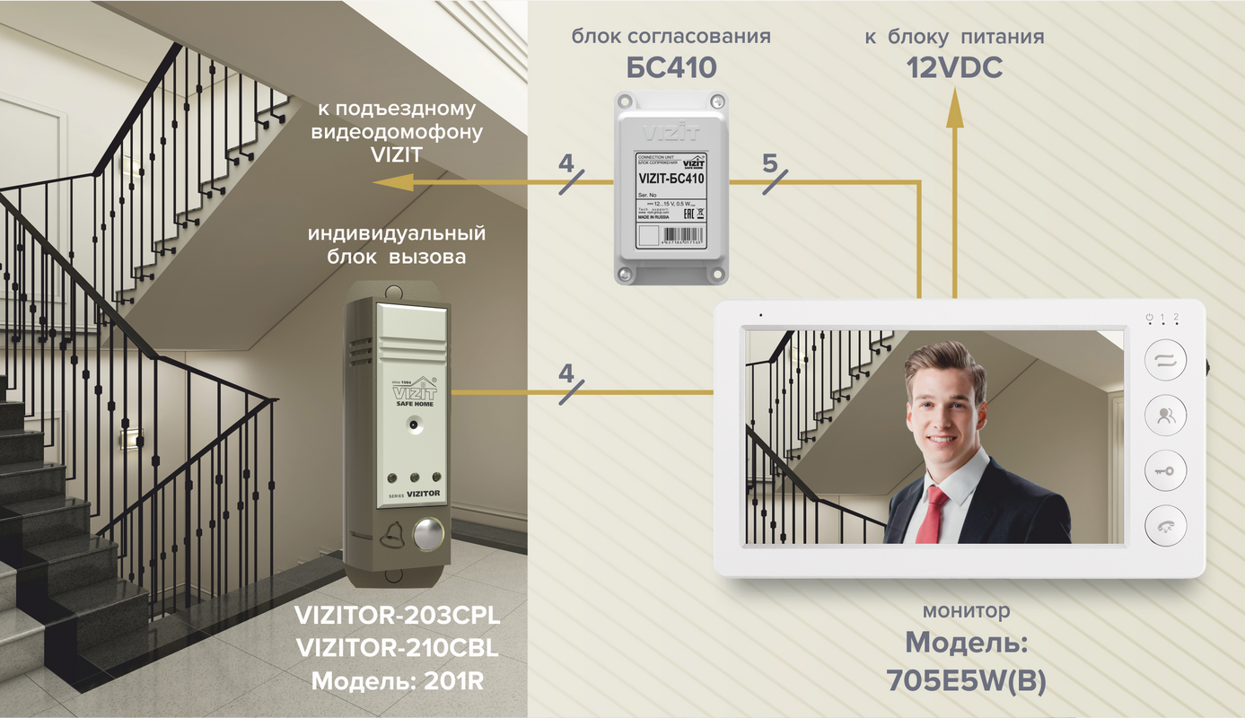 Блок сопряжения VIZIT-БС410 (в дальнейшем - блок) предназначен для подключения Монитора 705Е5 (или подобных) к линии связи и видеосигнала многоабонентских видеодомофонов VIZIT.
