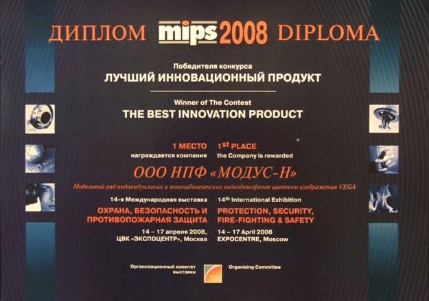 На проводимом в рамках выставки конкурсе “Лучший инновационный продукт” модельный ряд видеодомофонов цветного изображения “VEGA” занял первое место в номинации “Системы контроля и управления доступом”.